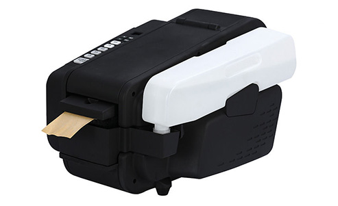 Podawane fragmenty taśmy są zwilżane wodą o odpowiedniej temperaturze i od razu gotowe do przyklejenia. Elektroniczny podajnik taśmy papierowej posiada dwa ostrza pionowe zapewniające czyste i długotrwałe cięcie taśmy. Dyspenser posiada regulację nawilżenia taśmy w 3 poziomach.